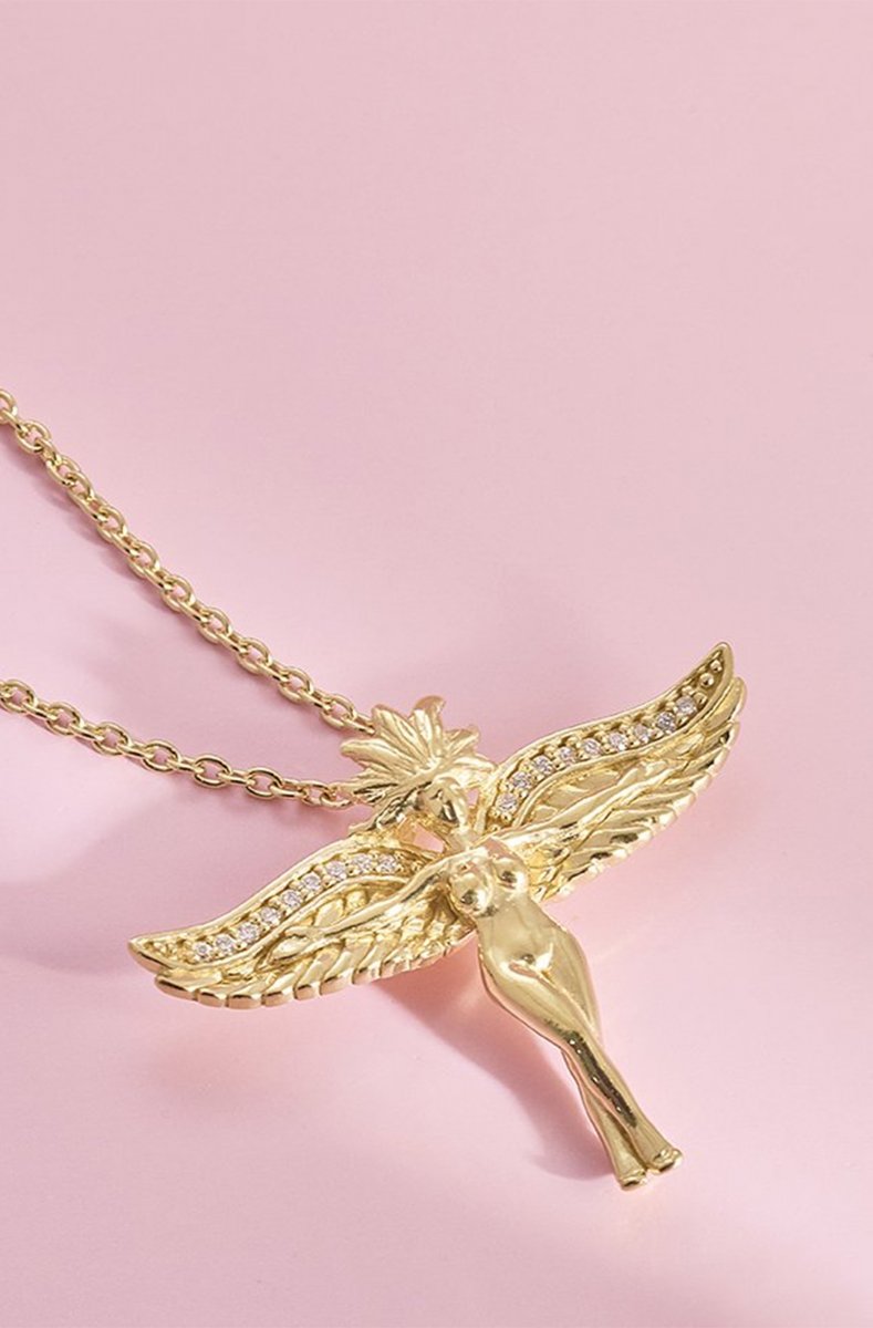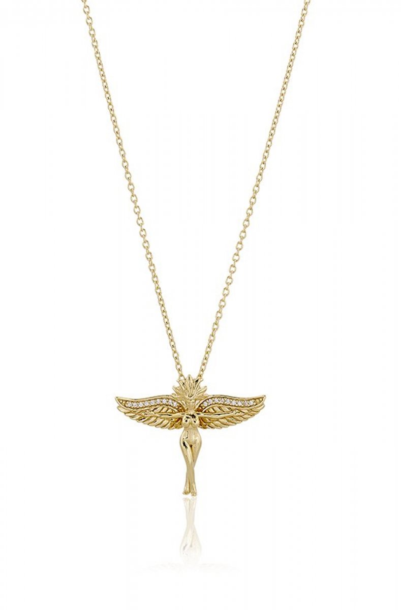 Material: 24k goldplated 925 sterlingsilver. Stone: Cubic zirkonia. Size: Chain 70+3cm. Goddess 25x31mm.