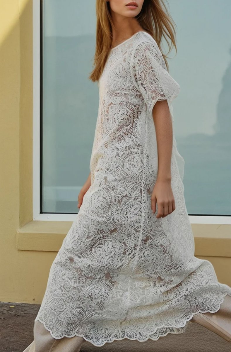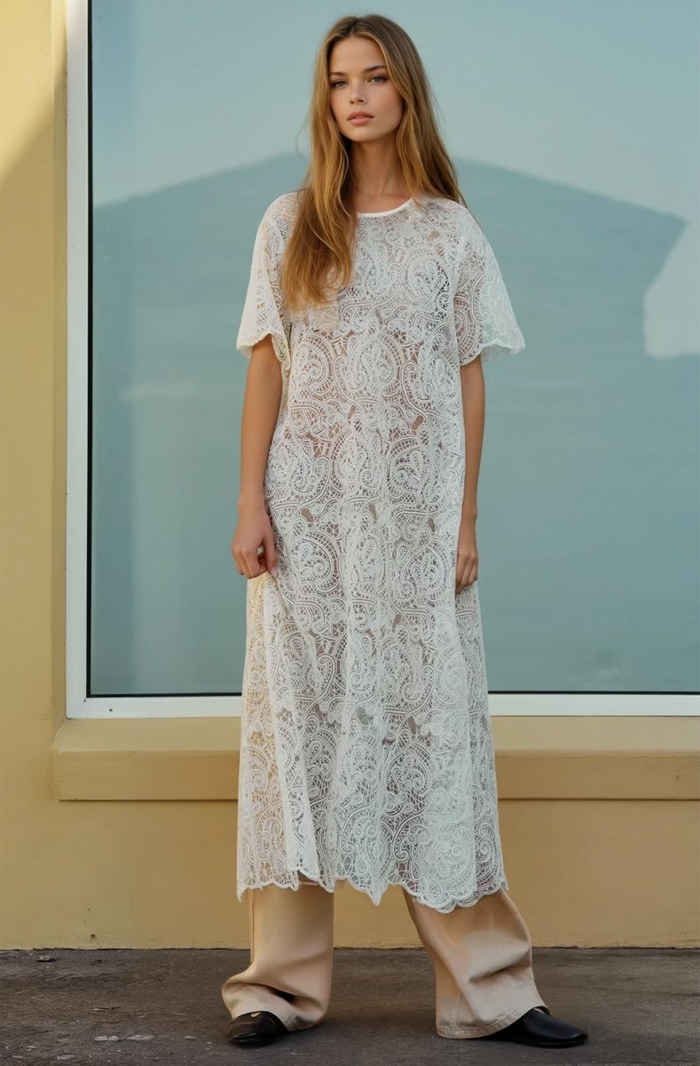 Roma dress features intricate lace detailing for a delicate look. The relaxed fit and flowing silhouette make it perfect for layering. With short sleeves and a soft, airy feel, this dress is ideal for adding a touch of elegance to any outfit.