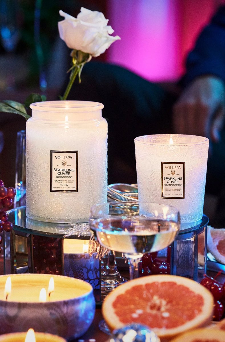 Pop a bottle of Voluspa’s finest blend, it’s time to celebrate! A mix of beautiful aromatic complexity, Sparkling Cuvée opens with vivacious fruit tones of Sparkling Wine, Pomelo and Red Currant. The effervescence of Sparkling Wine is the heart of the celebration, with bubbles cascading to the surface, dancing and mingling with juicy Nectarine and Bulgarian Rose Petals. A velvety, smooth finish of Woody Oak serves as the perfect stage for this aromatic affair. Raise a glass of Sparkling Cuvée, your olfactory aperitif for every unforgettable occasion.