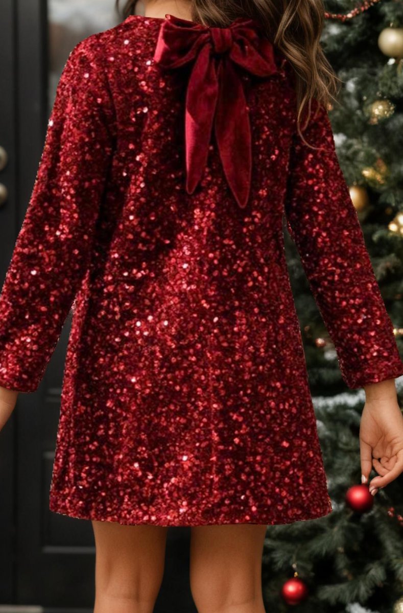 Children's party dress in velvet adorned with sequins, perfect for festive evenings. Elegant bow at the back.