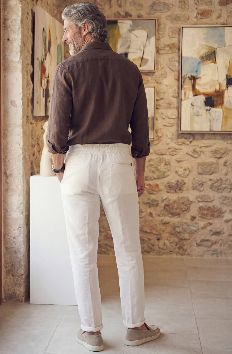 Refined trousers crafted from a breathable blend of linen and cotton. The lightweight fabric offers natural airflow and comfort during warm days while maintaining a clean, tailored silhouette. Designed as a versatile wardrobe essential for effortless summer dressing.