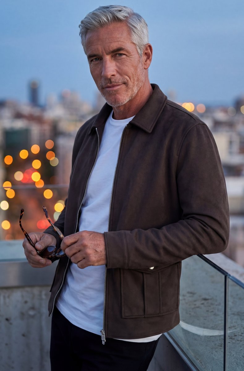 Vegan suede jacket with way ykk zippers. Navy satin lining and two outside flap pockets.