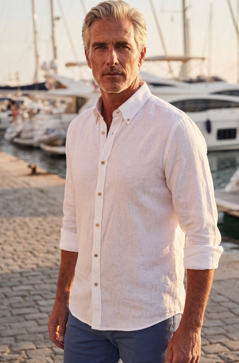 Linen fabric has long been a practical and beloved material, especially during warm seasons thanks to its ability to 'breathe' and quickly absorb moisture. Our linen shirt, made from the finest linen fabric, is available in a variety of colors. With a straight and classic fit, the shirt can easily be dressed up with stylish accessories such as shoes and trousers. For a more relaxed look, it pairs perfectly with linen pants and loafers – a cool and elegant outfit for sunny days.