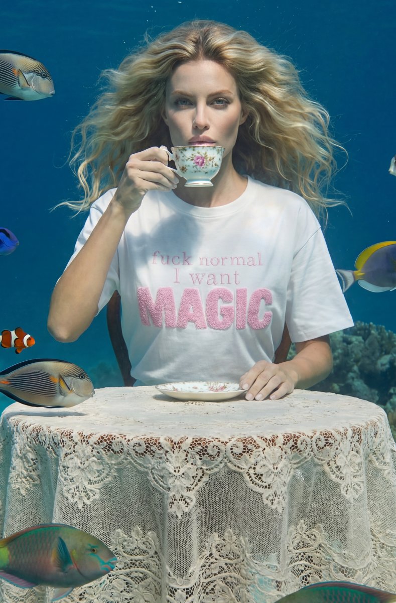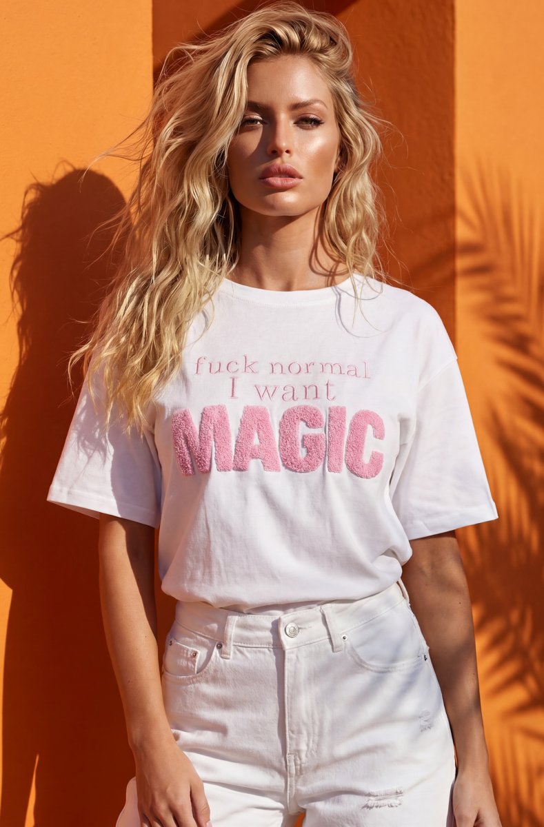 With the message “Fuck normal – I want MAGIC” embroidered on the chest, this t-shirt sets the tone immediately – playful, confident, and impossible to ignore. A perfect statement piece for those who want to express their personality with style.