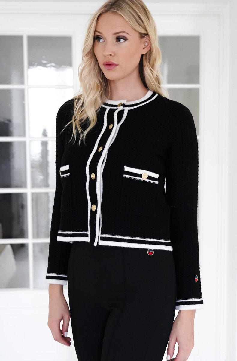 Gweneth Jacket Contrast is a knitted jacket made from a soft wool blend, elevated with bold contrast details. The neckline, hem, and pockets are highlighted in a contrasting shade, giving the classic silhouette a modern twist. The textured knitting technique adds subtle depth to the design, while golden B-buttons complete the look with elegance. Pair it with the matching Gail Skirt for a striking co-ord set, or wear it with trousers for a versatile everyday outfit.