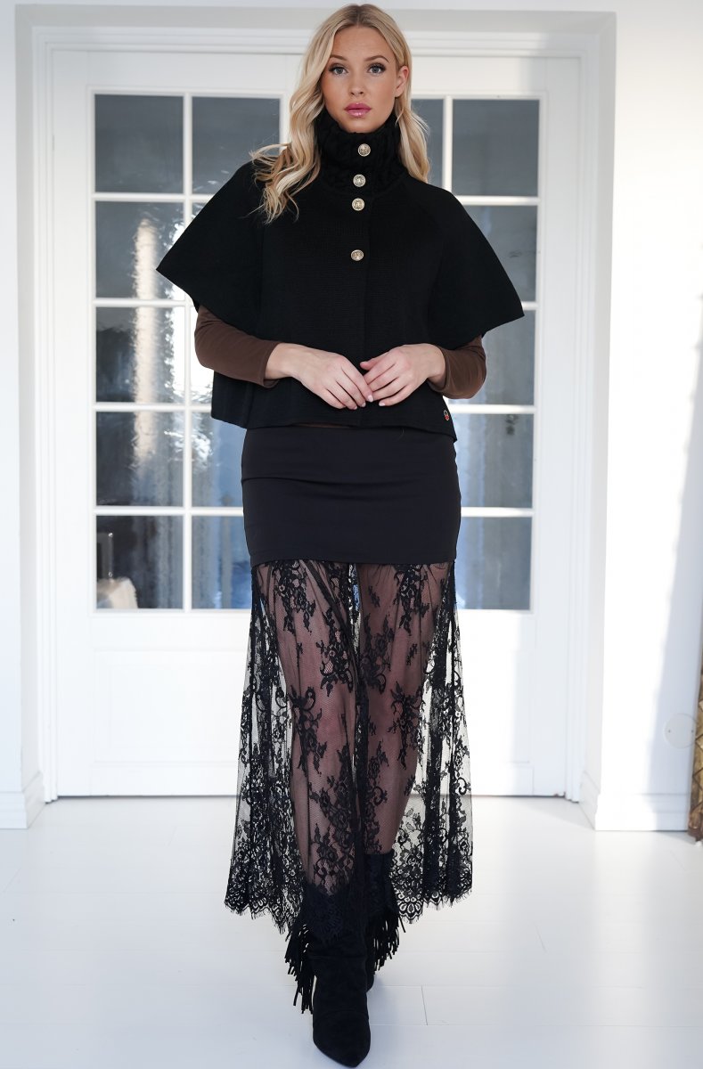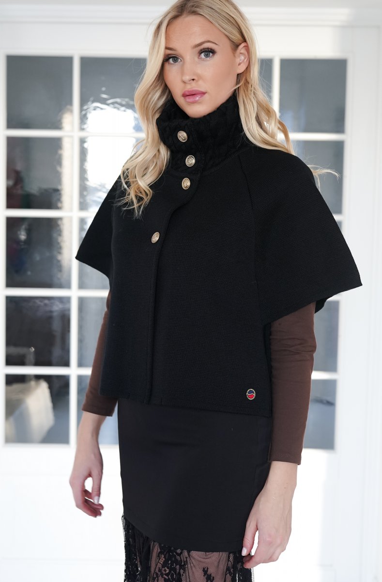 Lisalou Cableknit Collar Cape is a hybrid between a knitted cape and a cardigan. It is made in France in high-quality wool, with a boxy shape that sits on the hips, and a soft raglan sleeve. It has a high collar with a cable knit structure, and the front closure is finished with golden anchor buttons.