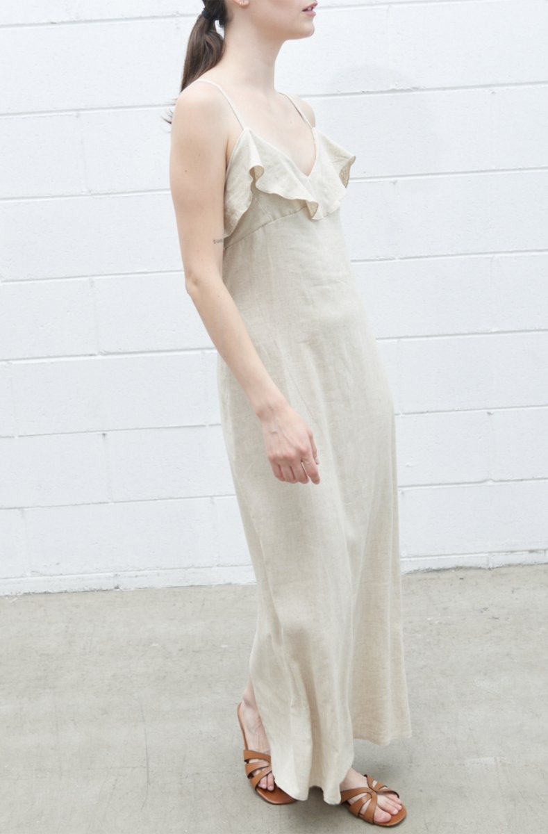 Long dress with thin straps and knot at the back. Wide front and back neckline with ruffles. Back zip closure.