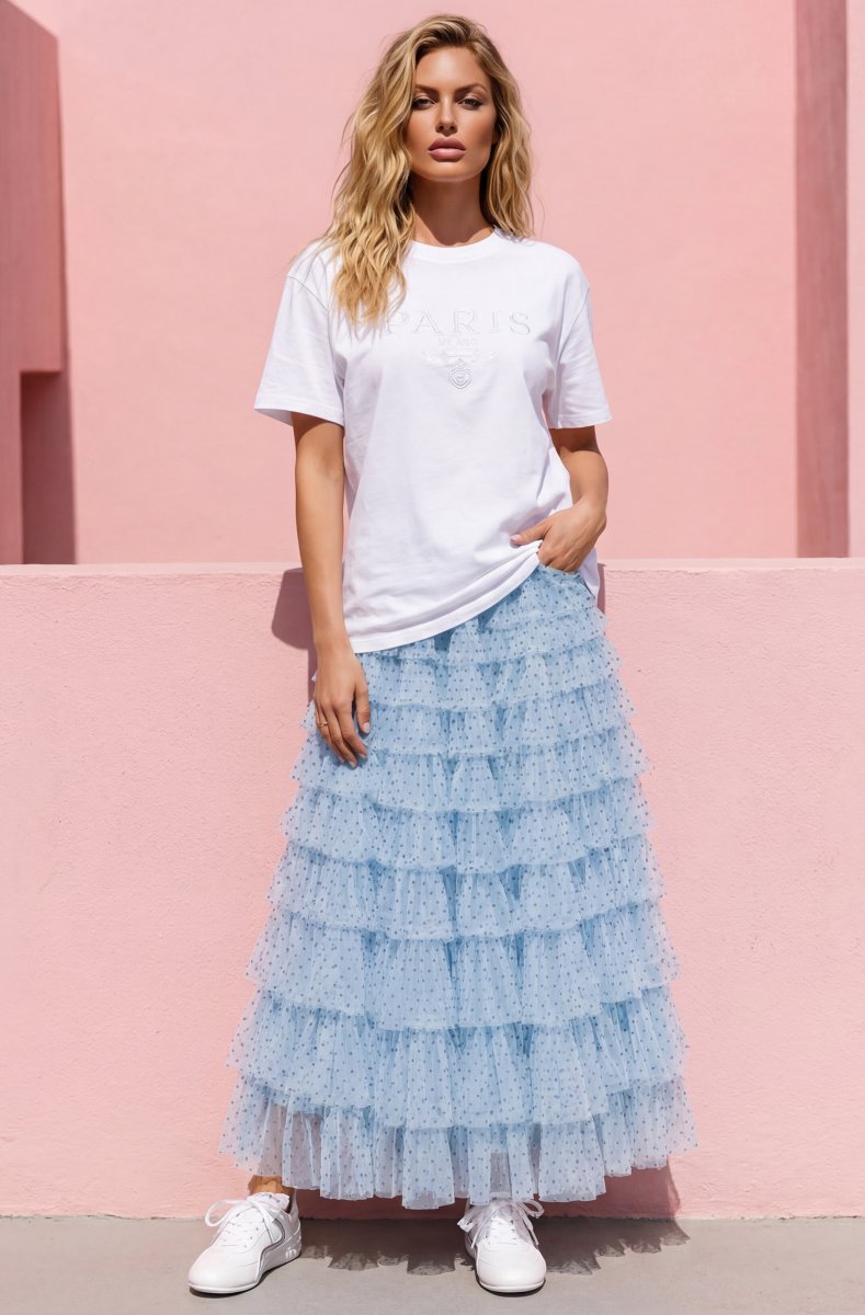 An absolutely lovely ruffle skirt in tulle - perfect for parties this spring or just dress down with a t-shirt with the skirt. Onesize and this one has elastic at the waist and fits up to XL.