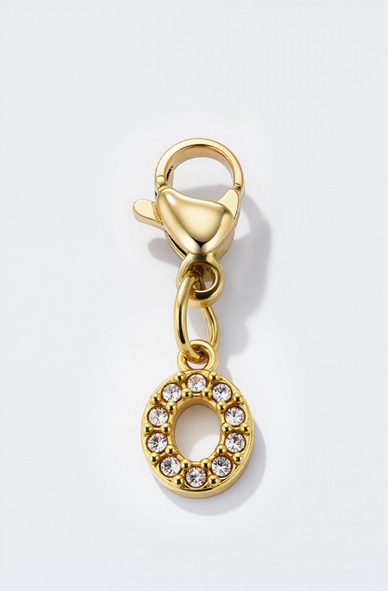 Gold letter charm with rhinestone details.