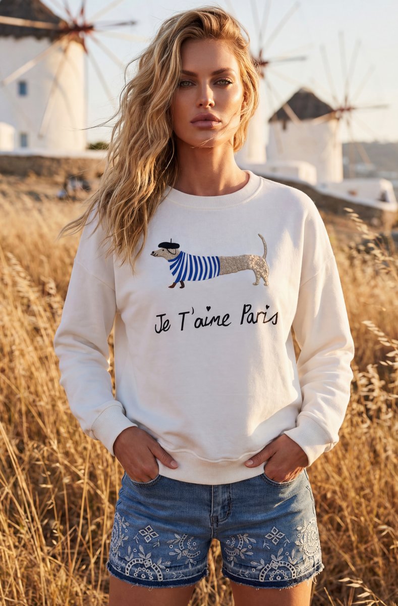 Cute sweater with Je Taime Paris print! One size and fits up to XL.