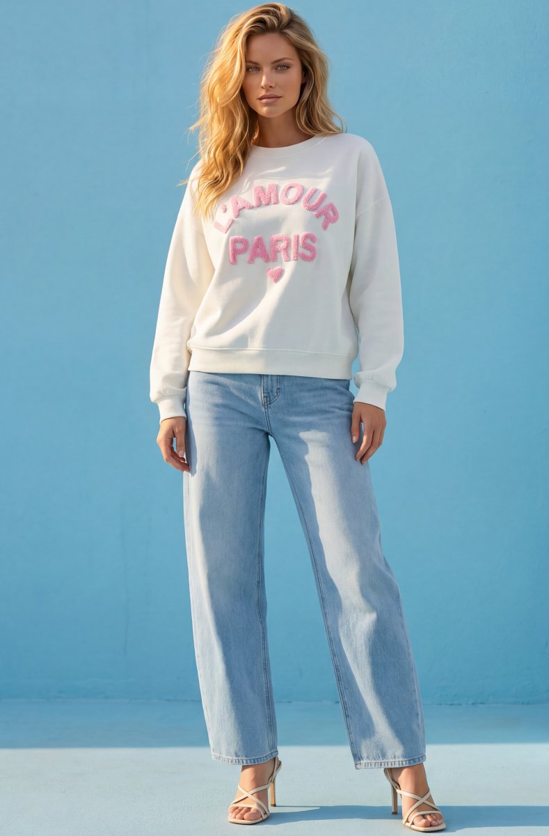 Cozy sweater with Paris text.