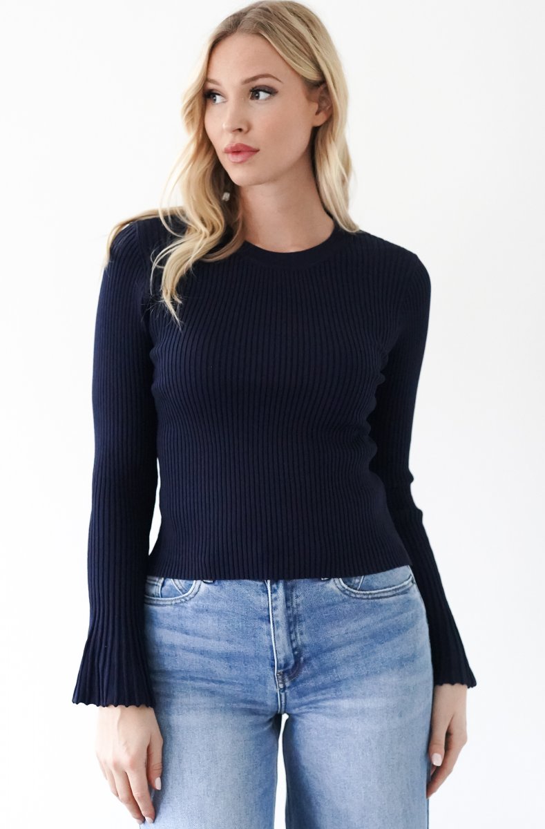 Ribbad snygg rundhalsad top med trumpetärm!
