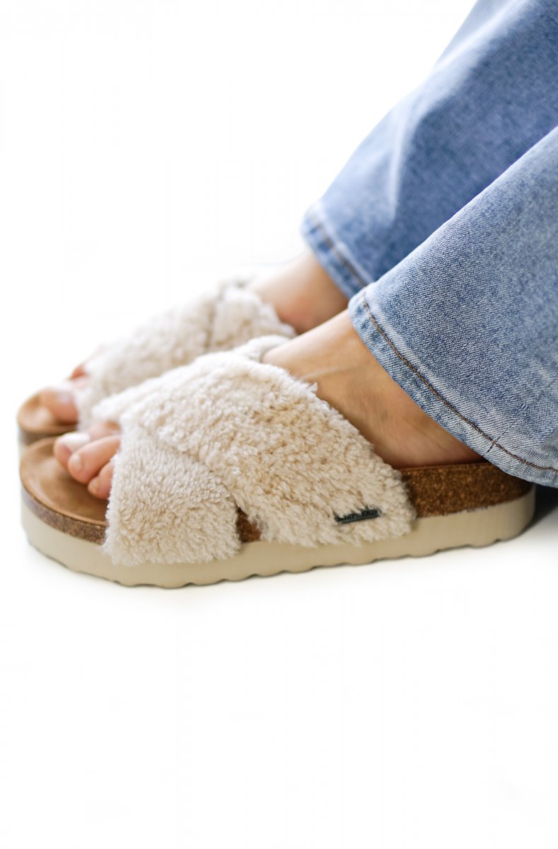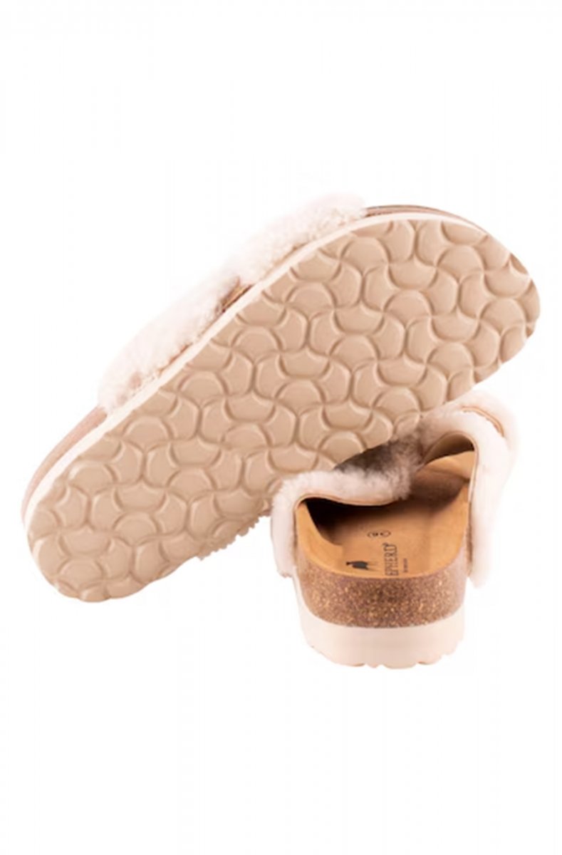 Shepherd Elsa. A pair of sandals with wide, cross-over straps in genuine sheepskin with an open toe. The foot-shaped cork sole is covered in suede to help the sandals breathe naturally. Rubber ribbed outer sole for a light and cushioned sandal.