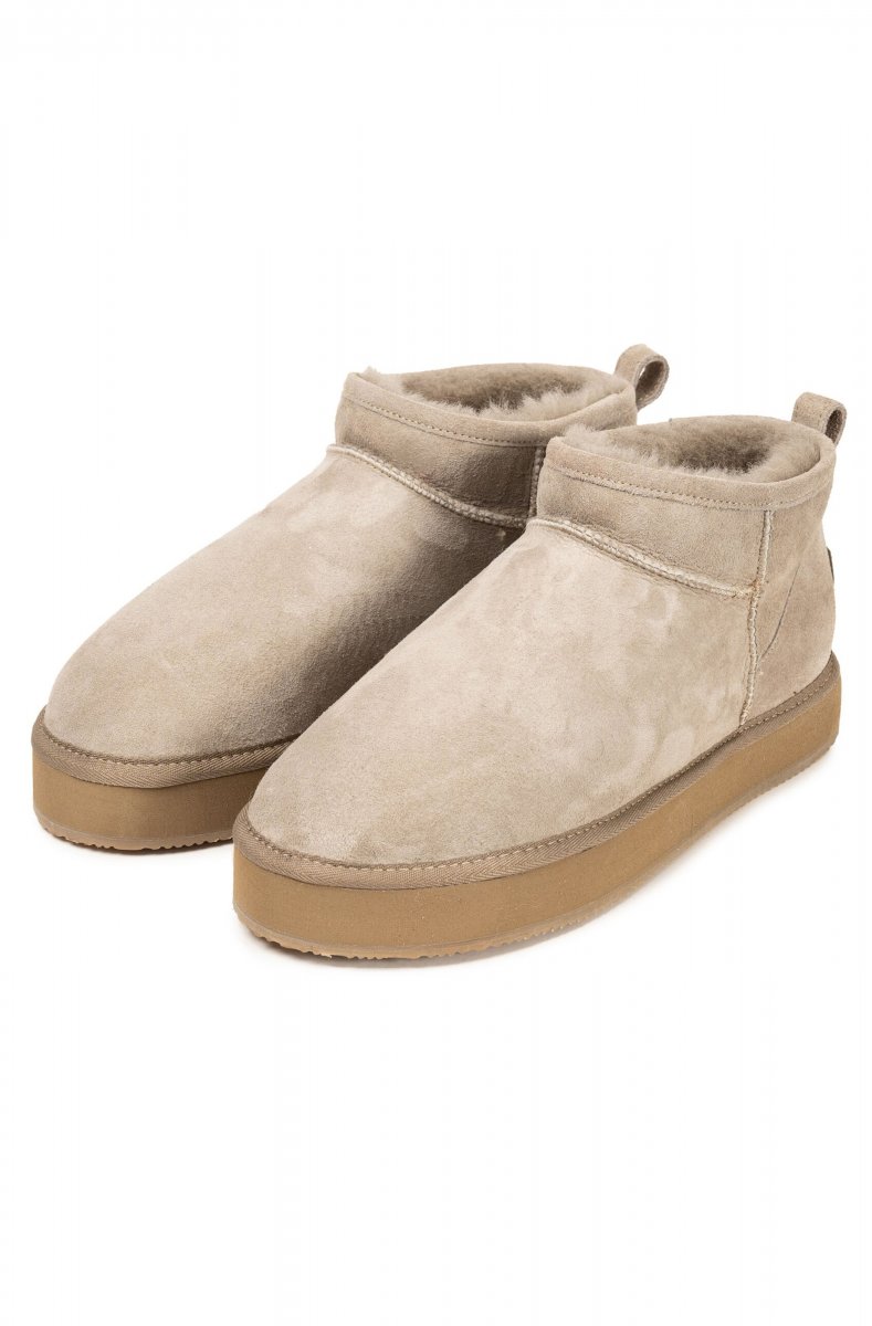 Shepherd Glasgow. A pair of low sheepskin boots. The boots have an appliqué and a heel tag. Soft sheepskin lining and insole. Outer sole with grooved underside. Sole height 2 cm.