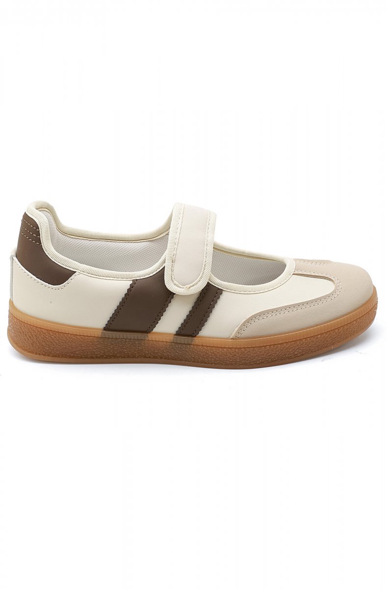 Cool sneakerinas in beige with brown details and one velcro strap.