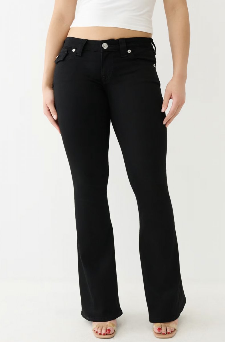 Time to give your closet a sleek upgrade with the Joey Low Rise Flare Jean. This pair of black jeans feature a low-rise waist, zip fly, belt loops, and a trending flare leg. Finished with clean hardware and flap pockets.